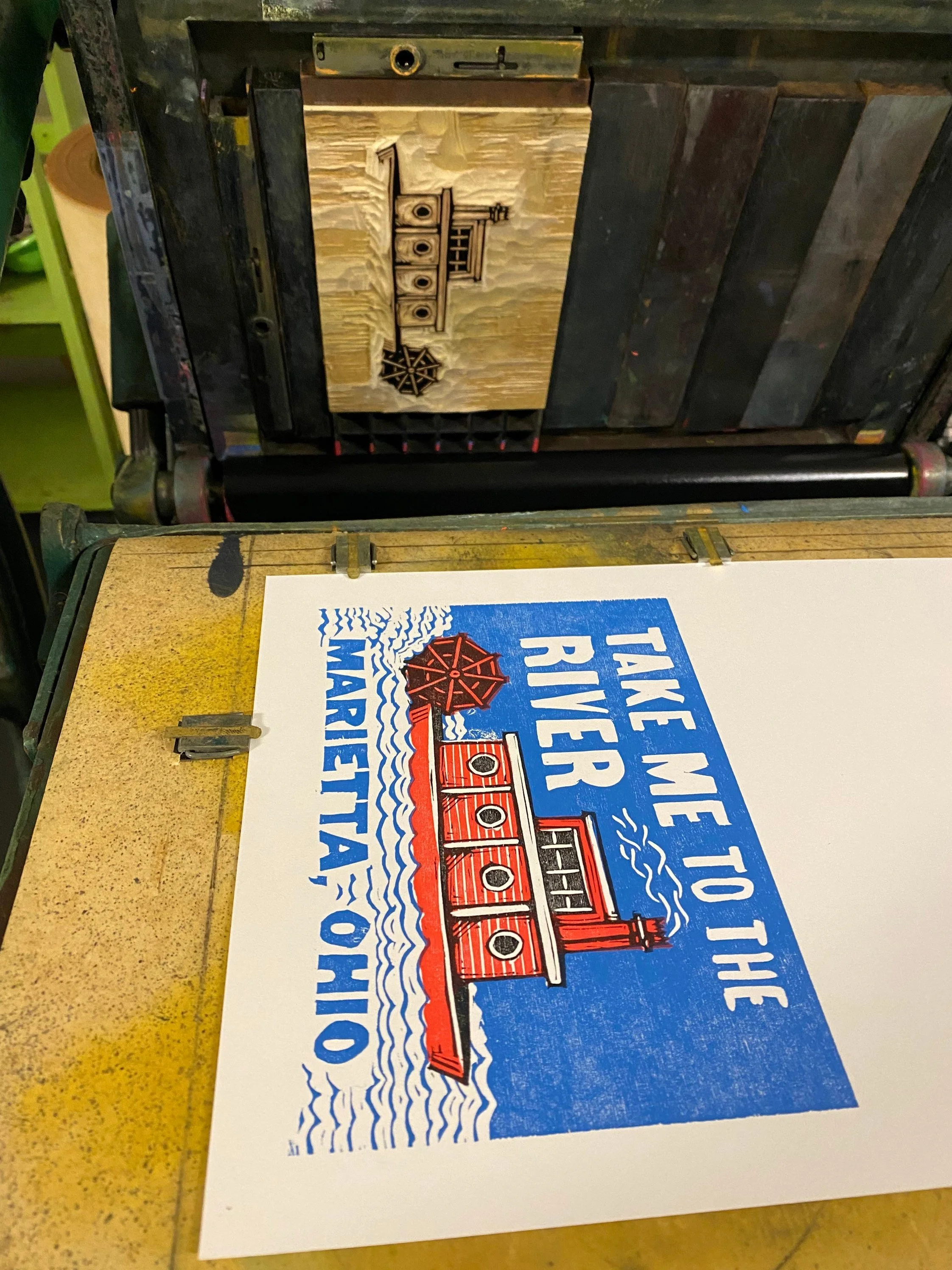 This 5” x 7” woodcut greeting card is a homage to our small river town of Marietta. A 3-color woodcut, printed on a foot treadle powered press built in 1888. Card is blank on the inside and comes with an envelope. Also, looks great in a frame.